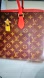 This bag features the classic Louis Vuitton monogram coated canvas with red leather trim, including double rolled handles and a detachable, adjustable shoulder strap.