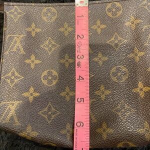 I added photos that are current. I was told she had makeup spill in the inside. I used it a few times but just want to sell. The zipper works but it is tarnished. Outside is in good condition. SEE PHOTOS. Sold as is.
