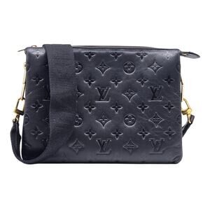 Elevate your everyday look with this stunning Louis Vuitton Coussin MM Shoulder Bag in black Monogram Empreinte leather. Made in Italy with luxurious embossed calfskin and gleaming gold-tone hardware, this iconic piece combines elegance with functionality. The adjustable black jacquard strap allows for versatile wear as a shoulder or crossbody bag.