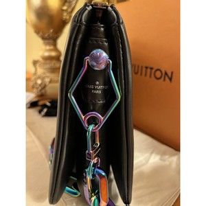 This Coussin PM is made from puffy lambskin with a shimmery finish an almost-holographic aspect on the Monogram pattern. Its accessorized with a removable chain, ornamented with an exquisite iridescent finish that changes from yellow color to subtle shades of blue, depending on the light.