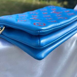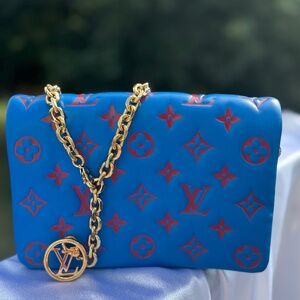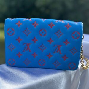 Elevate your collection with this Louis Vuitton Coussin PM in limited-edition blue lambskin embossed with red monogram. The Coussin is one of LV’s most sought-after designs, featuring plush pillow-like leather, a chunky removable gold chain strap, and versatile styling as a shoulder bag, crossbody, or clutch. This statement piece is both fashion-forward and practical, designed to carry daily essentials in style.