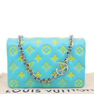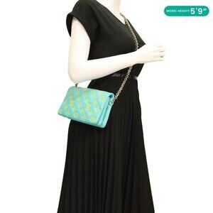 This stylish Louis Vuitton Coussin Pochette features monogram embossed leather in ice blue, adding a touch of luxury to any outfit. The crossbody design offers versatility and convenience, perfect for everyday use or special occasions.