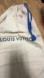 Elegant cream bag featuring Louis Vuitton logo. Blue drawstring closure.