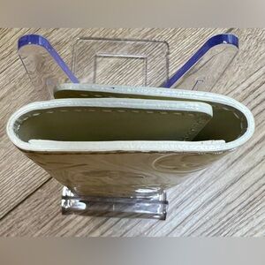 This Louis Vuitton wallet showcases a luxurious cream color, crafted from textured leather with a signature embossed LV logo pattern. Its sleek rectangular design and fold-over style make it a sophisticated accessory for any occasion.