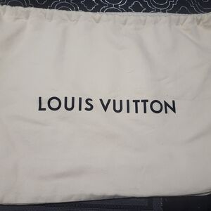 This Louis Vuitton shoulder bag showcases a light cream color and is made from a textured fabric, offering a luxurious feel. The bag prominently features the iconic Louis Vuitton branding in bold black letters, making it a statement piece. Its rectangular shape is ideal for carrying your essentials with style.