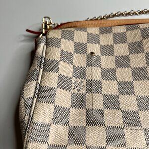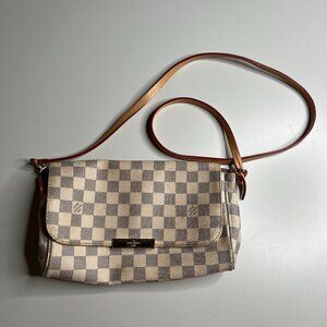 Authentic Louis Vuitton Eva Clutch Crossbody Bag in the classic Damier Azur canvas. Features natural cowhide leather trim, gold-tone hardware, detachable strap, and iconic Louis Vuitton Paris plaque on the front. Date code SP0635 indicates production in France, March 2005. 🔹 Pattern: Damier Azur 🔹 Style: Eva Clutch / Crossbody / Shoulder Bag 🔹 Hardware: Gold-tone 🔹 Interior: Beige canvas lining with pocket 🔹 Strap: Removable leather crossbody strap 🔹 Made in France Condition: Pre-owned. Exterior canvas shows normal wear with light signs of use. Leather strap and trim patina from age. Interior has noticeable stains/marks (see photos). Hardware has scratches from use. Still functional and stylish. ✨ A perfect addition for Louis Vuitton collectors or for everyday chic wear.