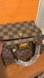 Elegant checkered design with red interior. Gold-tone accents add luxury.