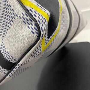 This bag is crafted of oversized new Damier Canvas in white with a navy blue "V Gaston" logo and was inspired by the 35th America's Cup. This keepall features rolled leather top handles an optional adjustable on the go travel strap and silver hardware. This is a preloved bag and there are two marks specifically on bag. I have taken photos of them. Please reach out for additional information.