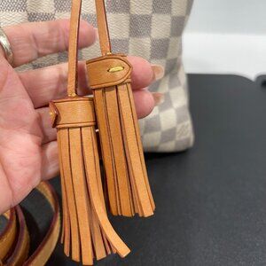 Louis Vuitton top handle bag. From the 2018 Collection. Neutrals coated canvas. Damier Azur Pattern. Brass Hardware. Leather Trim. Flat handles and single adjustable shoulder strap. Leather and tassel accents. Canvas lining and three interior pockets. Zip closure at top. Protective feet at base. This is a preloved item with signs of use and wear. Please take a moment to look at photos for condition. Inside there are marks and stains. Chapes are curling. Cute tassel accent. Please take the time to look at photos. Reach out for additional information.