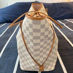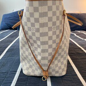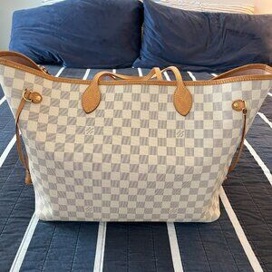 Louis Vuitton Neverfull GM in blue-check Damier Azur coated canvas exterior with pink Rose Ballerine interior and natural cowhide-leather trim. Very good, gently used condition with a pristine exterior and a few marks on the interior - see photos. Dimensions: 15.4 x 12.6 x 7.5 inches (Length x Height x Width) Includes pink interior tote organizer which can hold upto a 15-inch laptop. Includes dust bag.
