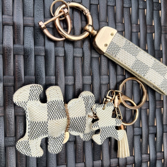 LV comes with 2 keychains. My grandson got me definitely the keychains are not real the bagdefinitely is. He personally picked them out. I think they’re super cute so I’m throwing them in with the purse also comes with dust bag .