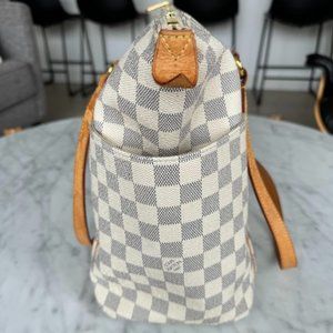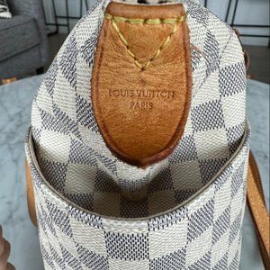 White coated canvas with Damier Azur pattern and features vachetta leather finishes, brass hardware, dual flat leather shoulder straps, exterior side pockets and fabric interior lining.