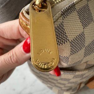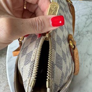 Exterior - Damier Azur coated canvas with natural cowhide leather trim and gold-color hardware, outer pockets on each side, and a top zipper closure
