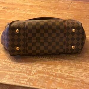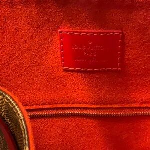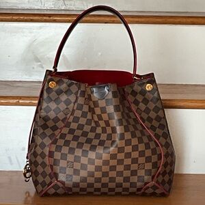 This is a genuine Louis Vuitton Damier Ebene Caissa Hobo Bag. This is crafted of classic LV coated checked canvas with a gorgeous red trim. The inside is the same gorgeous red with interior pockets. There is a looping shoulder strap with polished brass, Louis Vuitton anchors. I hate to see it go. It is in fantastic condition. You are going to Love Love Love it!