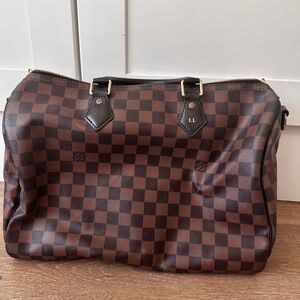 Elegant handbag with iconic checkered design. Features rich brown tones. Ideal for versatile styling. HAS EMBOSSED INITIAL (maybe your initials are LL too!) 😊