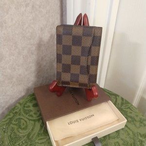 Authentic Louis Vuitton Damier Ebene* Card Case Organizer Wallet. Condition is excellent with almost no wear - just some very light rubbing to the interior leather. There is no peeling or stickiness in all the compartments. The wallet has 2 credit card slots, 1 business card slot, 1 external pocket, and 3 internal pockets. For something so small, it could hold a lot. Please examine all of the photos for the details. Comes with dust bag and gift box.