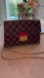 This compact wallet bag is crafted of Louis Vuitton damier coated canvas in brown. This bag features a removable brass chain-link shoulder strap with LV emblem. The bag has a flap secured by a brass S-lock and opens to a red suede/leather interior with 6 card slots, patch pocket and zipper compartment.