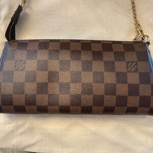 This gently-used Eva crossbody clutch was purchased new 10/2015 from a Louis Vuitton store in Oak Brook, IL (receipt in hand). Very good condition with no scratches or wear to any of the leather parts or strap. Minimal wear on inside red lining, quite clean. Zipper, clasps all working. Emblem has a few scratches from wear. Original dust bag and box included.