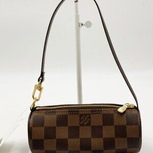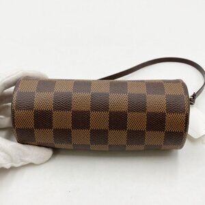 This is an authentic LOUIS VUITTON Damier Ebene Mini Papillon. This petite cylindrical handbag is crafted of Louis Vuitton signature damier coated canvas in brown. The bag features chocolate brown leather piping and a matching strap with a polished brass D-ring clasp. The top zipper opens to a terra-cotta crossgrain leather interior.