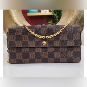Authentic Louis Vuitton Damier Ebene Envelope wallet, upgraded to a crossbody with unbranded added chain Exterior canvas is in good condition Front snap closure works properly