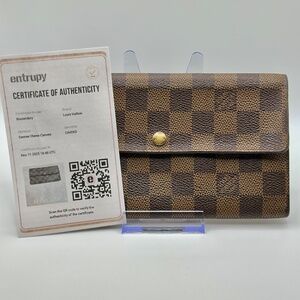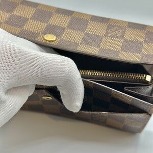This Louis Vuitton Damier Ebene Sarah Wallet features two card slots on the front and comes with a Certificate of Authenticity (COA) by Entrupy. There are signs of minor wear from regular usage on the hardware and the sides. The zipper is smooth like butter and the button snaps great.