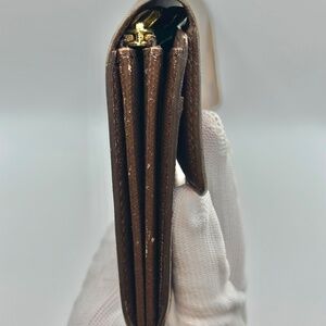 This wallet does have a callout. As seen in the photo, there is a tear/separation which can easily be fixed by your local cobbler. This could also be an easy DIY repair with a type of leather adhesive. Overall this LV Sarah Wallet is in beautiful condition and has so much life left!