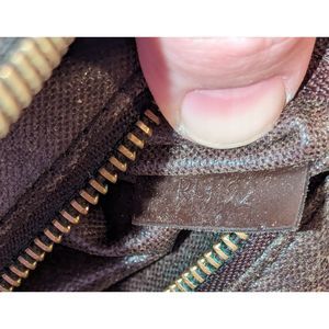 The edging color has rubbed onto canvas. It is not noticeable due to the canvas color. Review the last photo to see what I am talking about. I have it circled. Canvas is that way around the entire bag. This is pretty common in older Ebene bags.