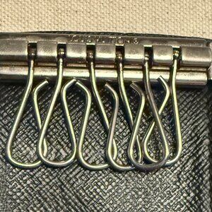 This compact case holds six keys on individual brass hooks. In Damier Graphite canvas, it is a practical accessory for a handbag or briefcase.