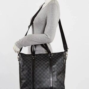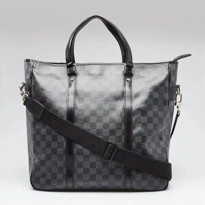The Louis Vuitton Graphite Damier Canvas Tadao Tote Bag is the ideal city bag for the style conscious man or woman. This laid-back yet elegant tote provides fashion and function. Amazingly roomy, the Tadao offers modern looks and unmistakable LV style! The Tadao is constructed with LV's signature Damier canvas in graphite. The roomy interior is lined in durable canvas and features two pockets for securing smaller items. This bag is a must have to carry personal or professional items in comfort and style! Retail price is $2110.