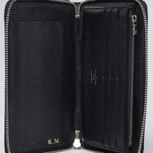 The exterior is clean and beautiful throughout with rubbing and wear to the glazed corners. The zipper pull has light surface scratches. The interior is clean with some creasing and signs of use. Overall the wallet remains in good condition. Please note the interior is hot stamped with the initials 'KM'.