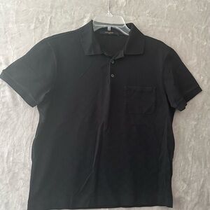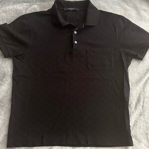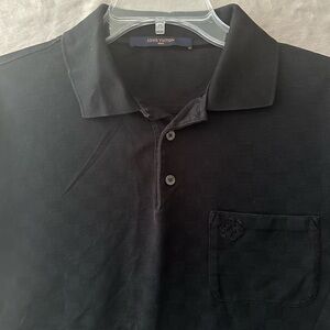 This black polo shirt by Louis Vuitton showcases a classic design with a traditional collar and short sleeves. Crafted from a comfortable knit fabric, it offers a sleek and versatile look perfect for any casual setting.