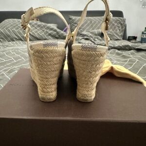 Classic Damier Azur coated open toe canvas espadrille wedges, gold tone stud accent and adjustable strap, 4 inches high. Size 5, in very good condition, come with box, dust bag and cards.