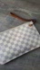 Authentic...Stylish checkered wristlet clutch with a brown strap. Perfect for any occasion.Louis Vuitton Damier Azur Canvas Neverfull Pochette. the unbranded band was fixed and attached see photos also the zipper is broken see photos...as for everything else looks good . Stitching and edge looks great ..