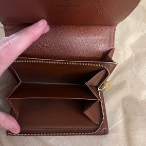 Chic wallet with iconic monogram design. Features secure snap closure. Ideal for stylish organization.