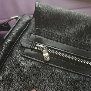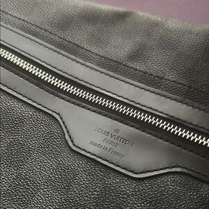 Sleek Louis Vuitton messenger bag with a dark checkered pattern. Ideal for modern style and practicality.