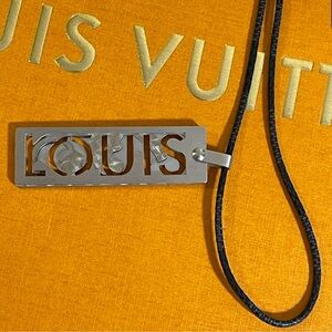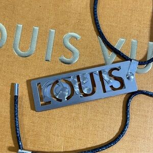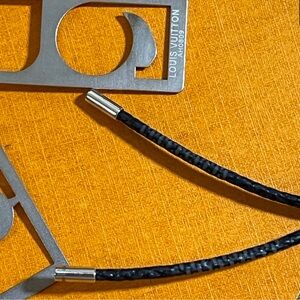 LV Damier Graphite Cord w/Louis spelled out in 5 silver plates. One of the metal plates has a design carved on it. Some wear on the LV Blue Damier Cord where it ties.