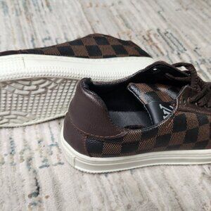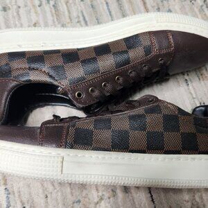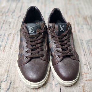 Louis Vuitton Designer Brown Sneaker Size 9. Key features include brown leather with checkered design and the "LV" logo on the tongue, low-top laced up sneakers, rubber outsoles, and stitched to perfection. This pre-owned shoe will give you luxury fashion without the high price.