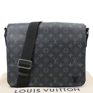 The LOUIS VUITTON District MM Messenger Bag in black Monogram Eclipse canvas offers sleek urban style. Spacious and versatile, it’s ideal for daily business or casual use.