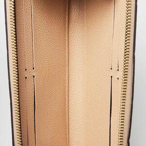 The exterior leather is clean and beautiful but has some darkening on the corners. The zipper pull has some color transfer and wear to the glazed edges. The hardware is bright and crisp. The interior is clean and in great condition with faint signs of wear.