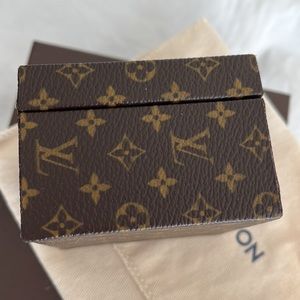 Authentic, Louis Vuitton Ecrin Declaration mini jewelry trunk. A glorious little cube, originally designed for presenting an engagement ring or a tiny treasure, to a loved one. Monogram mini print canvas, brass grommets, front and back. Brass S-lock with flip lock. Removable pillow with loop for bracelet, earrings or necklace replacement. Lined in a beige Alcantara cushioned fabric. Light tarnishing of brass, but I always polish before shipping. Includes dust bag and box. No tears, rips, marks, odor. Beautifully kept. France. AS0072. Price is firm for this little gem. Guaranteed authentic. France. #V128043929.