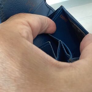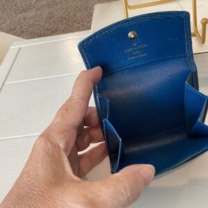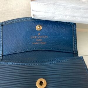 Authentic pre-owned Louis Vuitton Epi Elise compact wallet, 4”W x 3 1/4”H x 1/2”D, in blue. Embossed date code. Wear on leather of inside pocket (see picture).