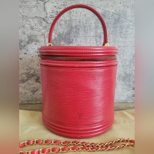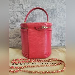 Authentic Louis Vuitton Epi leather Cannes handbag. How fun is this gorgeous bag?! This is truly a statement piece. Measures approximately 8" tall (without handle) x 7.5" wide. It fits so much inside y'all! In great condition. Comes in the absolutely stunning colorway Rouge. The Epi leather is great. Interior has no odors. Hardware is fantastic. Zipper runs smooth. Can add a long strap for more versitle wear. I will include the chic, brand new, unbranded strap pictured.