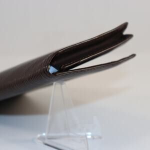 Authentic Louis Vuitton bifold wallet in classic brown Epi leather. Features multiple card slots and full-length compartments for bills or documents. Embossed LV logo on the lower corner. Interior shows some wear but overall structure is solid and functional. A sleek, understated piece ideal for business or travel. Made in France. Please see all photos for condition.