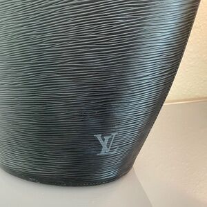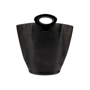 Vintage, black epic leather, acrylic handles, interior lining and pocket, open top (no dust bag), used, very good condition