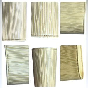 In excellent condition. There is a very, very small bit of wear on the corners--you can barely see it in the photos. I believe the color is vanilla but it is like a pale creamy yellow.