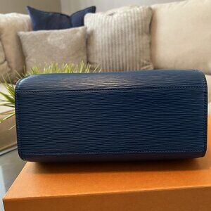 Louis Vuitton Epi Pont-Neuf handbag in blue cyan Epi leather, brass hardware, rolled handles, alcantara lining, two exterior pockets & zip closure at top.