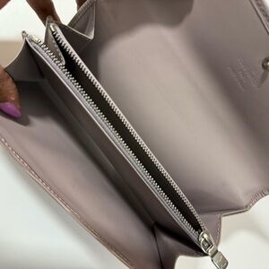 Preloved Sophisticated rare lavender leather wallet. Embossed Louis Vuitton branding. In like new condition. Review all photos for condition.