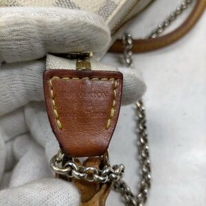 This Louis Vuitton Eva Damier Azur shoulder bag. Normal rubs, scratches, stains. One slight tear on an edge as seen in photo. In great condition with the chain and strap. Beautiful bag.