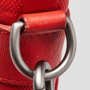 The exterior leather has some spots throughout along with rubbing and wear to the corners and to the piping throughout. The handles are clean but have rubbing to the undersides and to the glazing. The shoulder strap is clean but there are some spots and creasing throughout. The hardware is bright with surface scratches. The interior lining has rubbing and a couple spots present throughout.