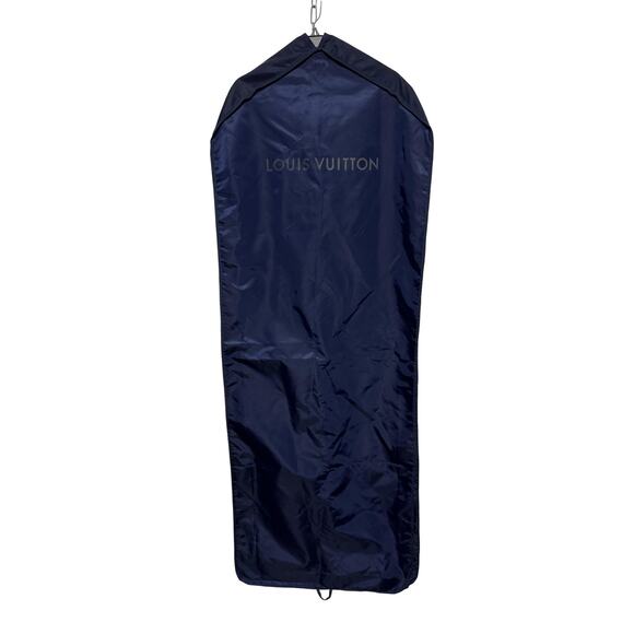Item: Garment bag / suit cover in navy blue with LOUIS VUITTON logo across front.